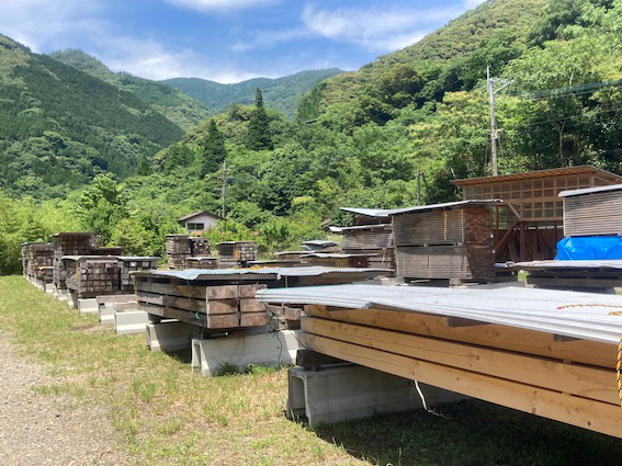 五木村の山で伐採された木材は、そのまま山で3ヶ月ほど水分を飛ばし、そこから搬出、製材。土場(木材の集積所)に運ばれます。