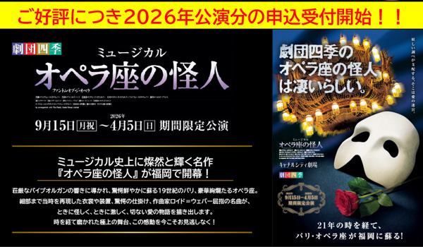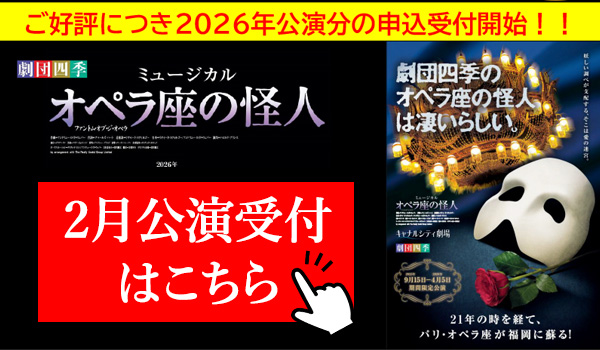 ■申込受付:劇団四季ミュージカル『オペラ座の怪人』2月公演は、9/29(月)~10/10(金)の間、申込受付をいたしました公演です。この配信をご覧になられた方のみ、お申込み受付をさせていただきます。ご了承ください。